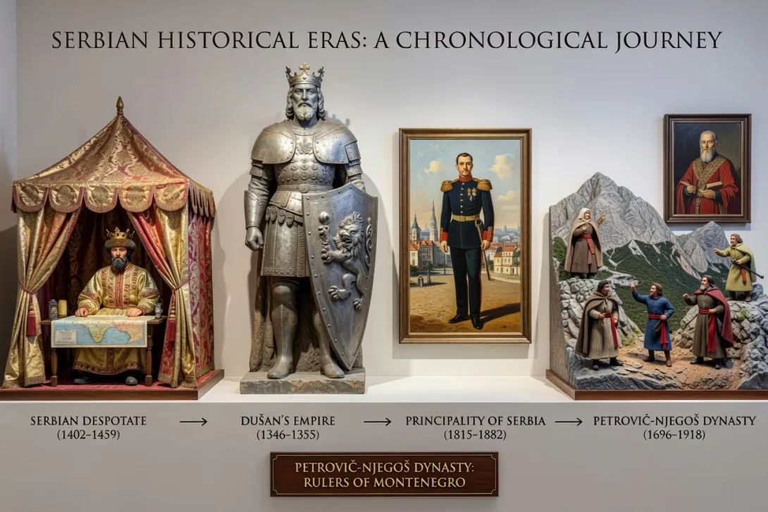 Srpska srednjovekovna istorija uči nas o usponu (kneževina Srbija, Carstvo Dušana), otporu (srpska despotovina) i preživljavanju (vladari Crne Gora, dinastija Petrović Njegoš). Ovo nije samo prošlost – to su koreni identiteta. Ako tražite dublje razumevanje, posetite manastire ili pročitajte primarne izvore poput Dušanovog zakonika.